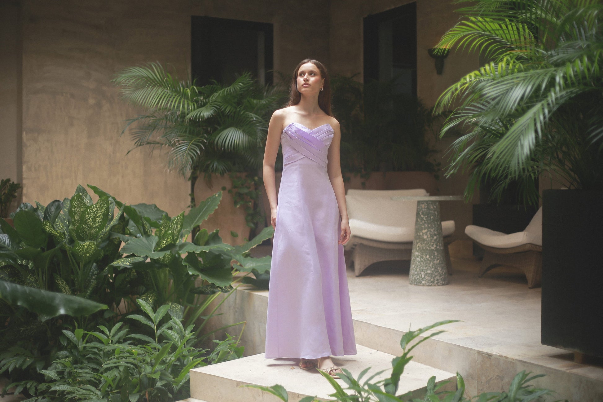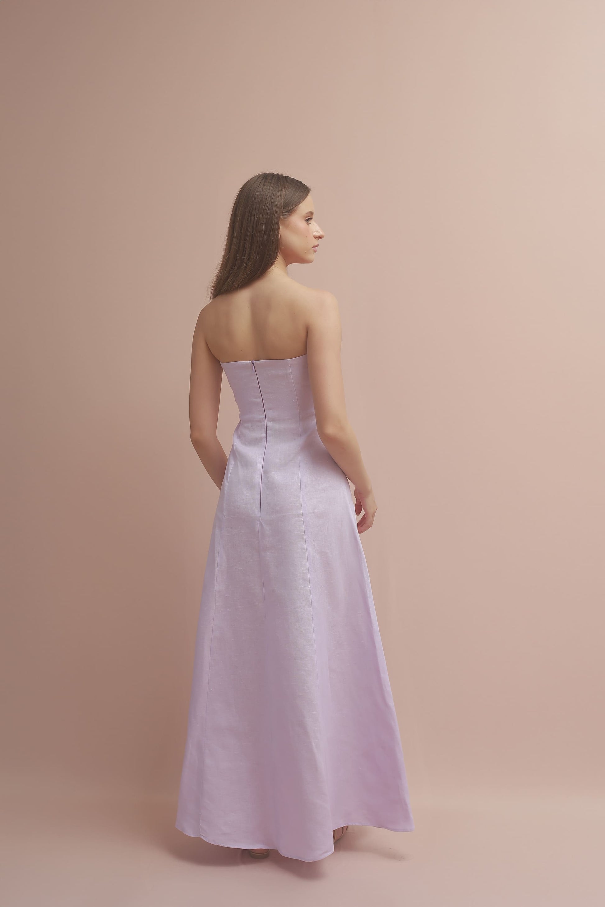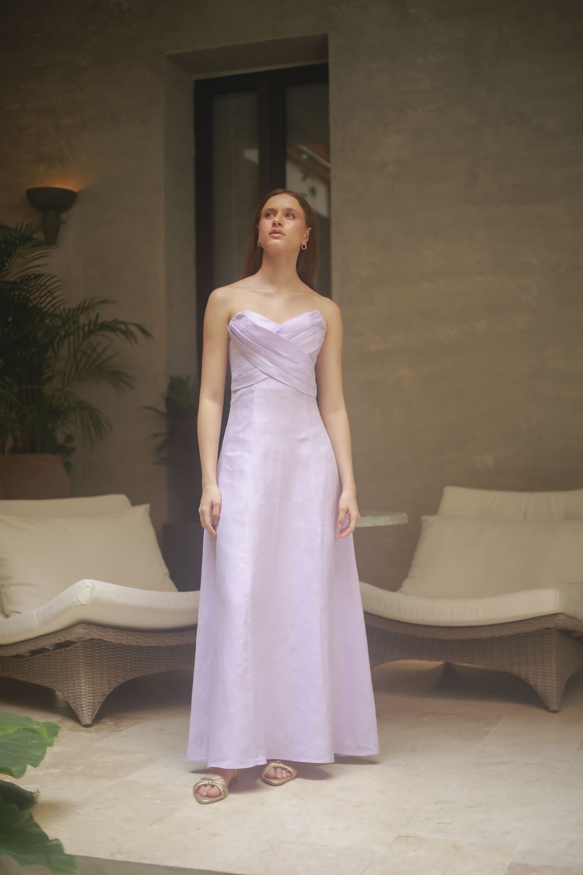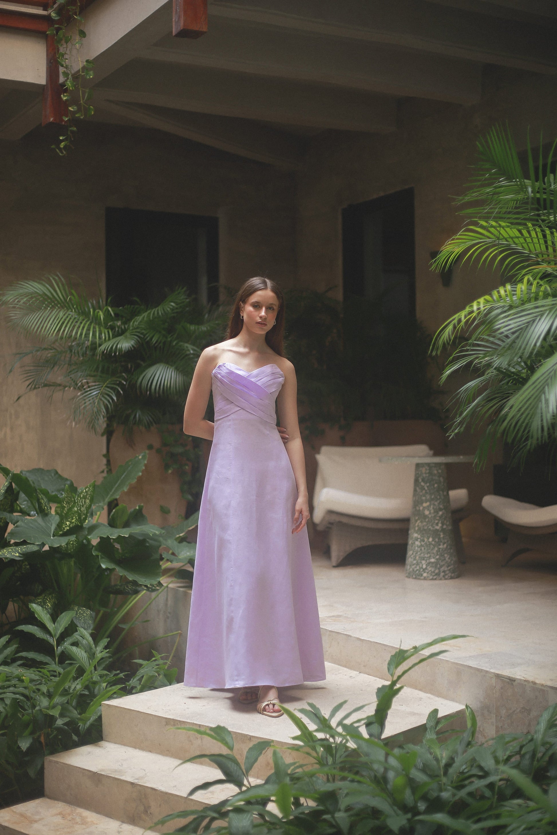 The "Amelia" dress is an elegant piece with a lot of style and sophistication. It is maxi and strapless. Presenting a unique design with two pieces that intersect in the front creating a beautiful drape. Its silhouette is fitted up to the waist and then delicately opens to the bottom.