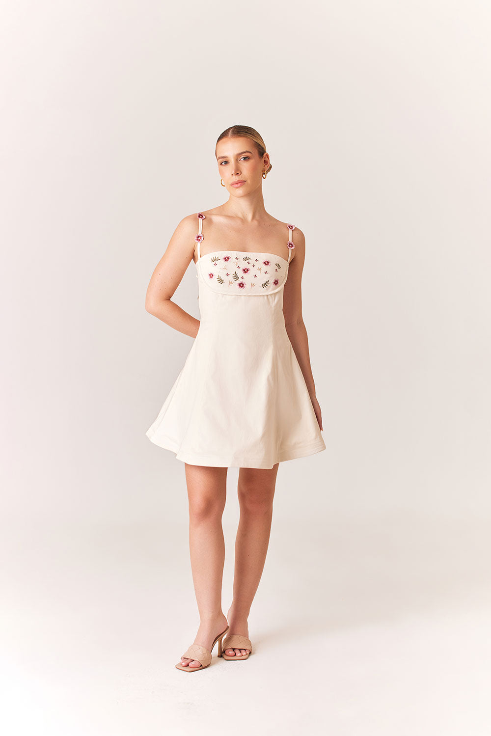 Aurora mini dress exudes charm and delicacy in every detail. Featuring fine embroidery throughout the fabric and embroidered floral appliqués on the straps, it showcases an artisanal and romantic touch. Its feminine and fresh silhouette makes it perfect for special occasions or sunny days with an effortlessly elegant vibe.