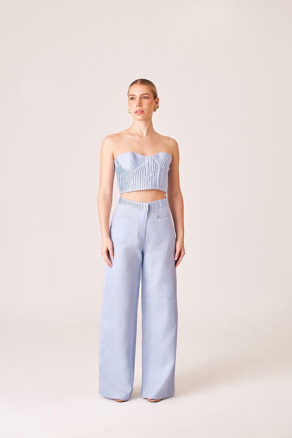 The "Celeste Pant" is the trouser version of the "Sorella" design, preserving its elegance and signature details. Featuring a straight-leg cut, faux pockets for a sophisticated touch, and pleated edges that match the rest of the design, this piece is perfect for a refined and versatile look.