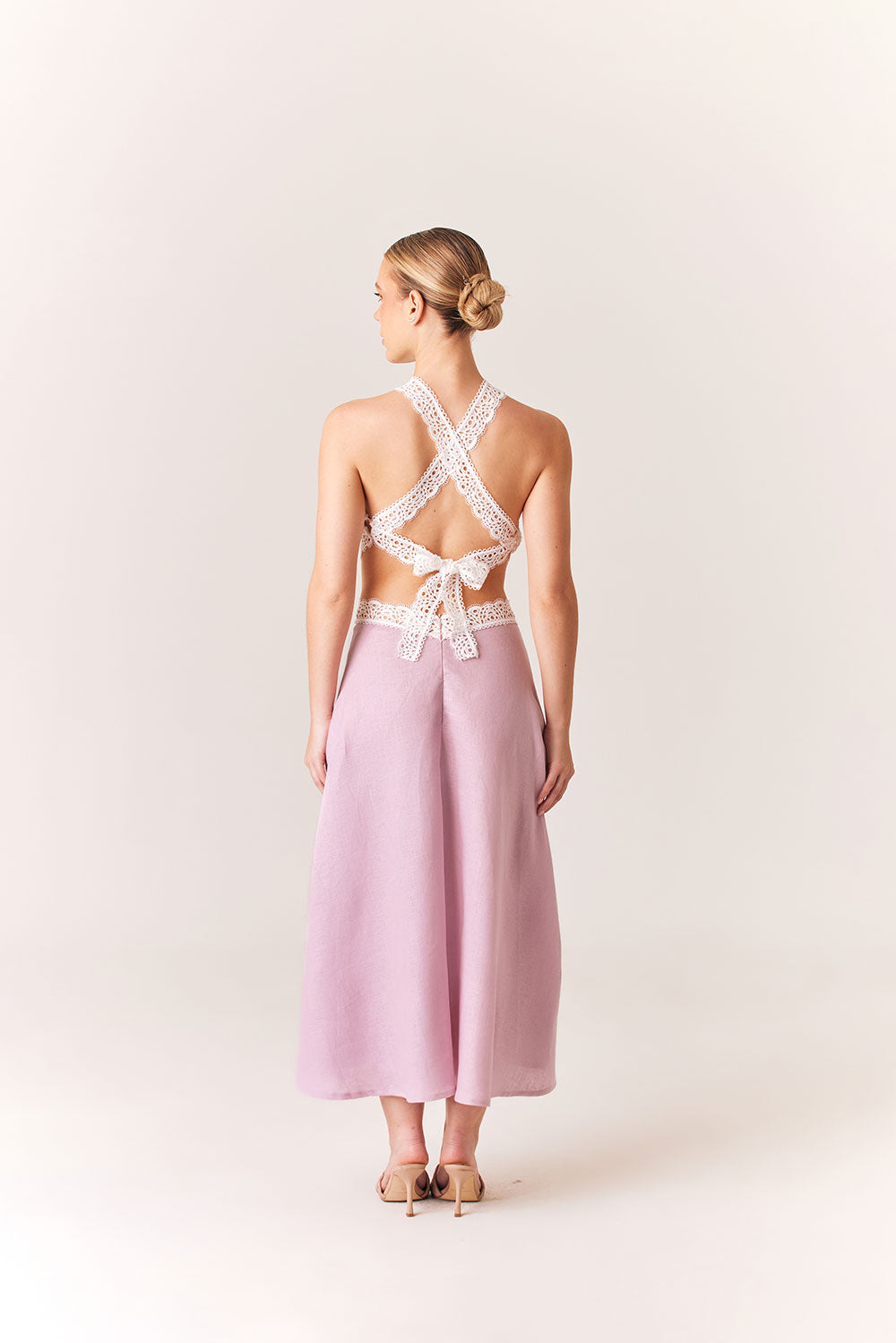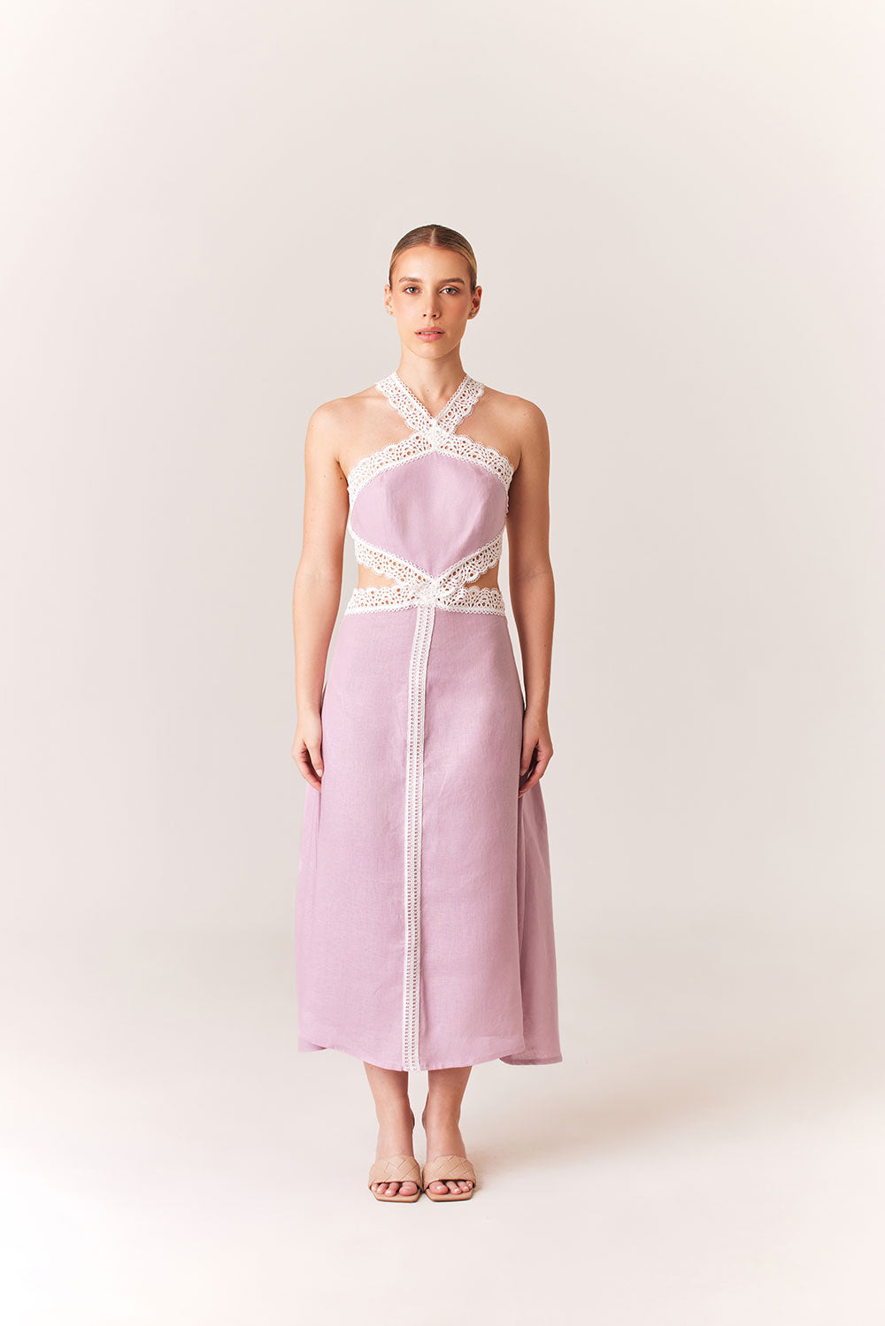 The "Celina" dress is a stylish and elegant piece, highlighted by its linen details. The open back closes with a bow made of the same linen that runs from the front. It has cutouts that add a modern touch and silhouette to the body. Its linen details, the same color as the dress, complement each other harmoniously, creating a distinguished dress. It is a new color of our "Contessa" Dress.