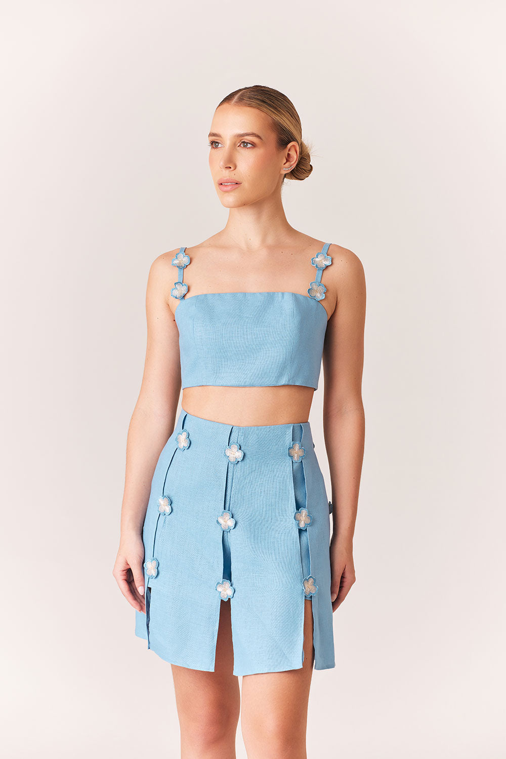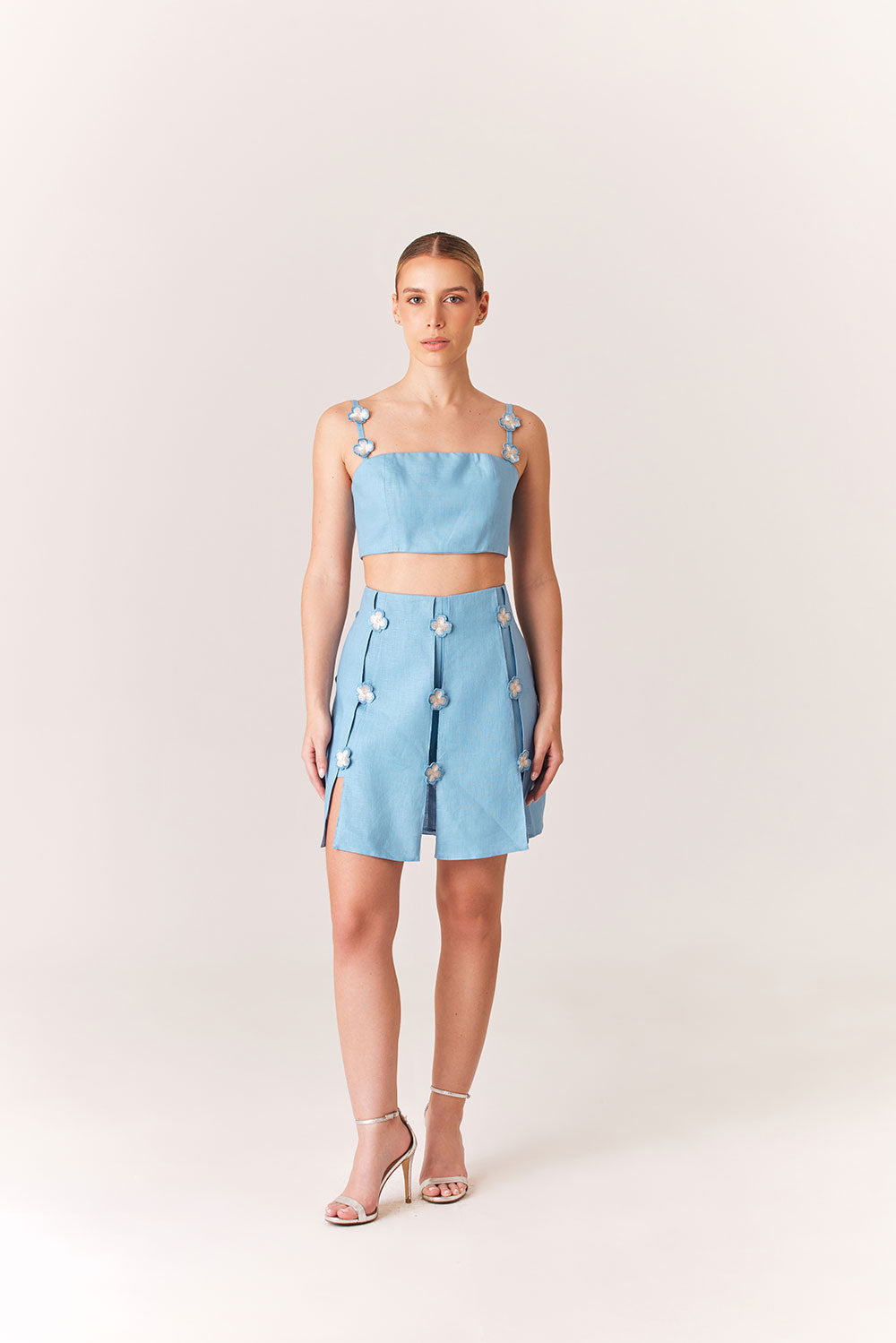 Dalia Set is crop top and skirt-short set, perfect for a fresh and feminine look. Both pieces feature delicate embroidered flowers, creating a charming harmony. The skirt is designed with straps connected by embroidered floral details, adding an artisanal and sophisticated touch. Ideal for sunny days or special occasions with a natural and elegant vibe.