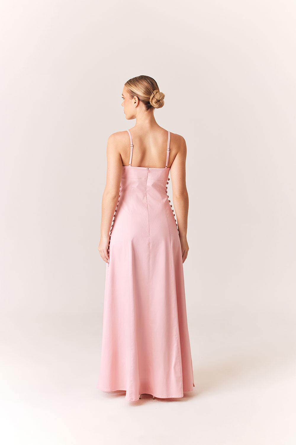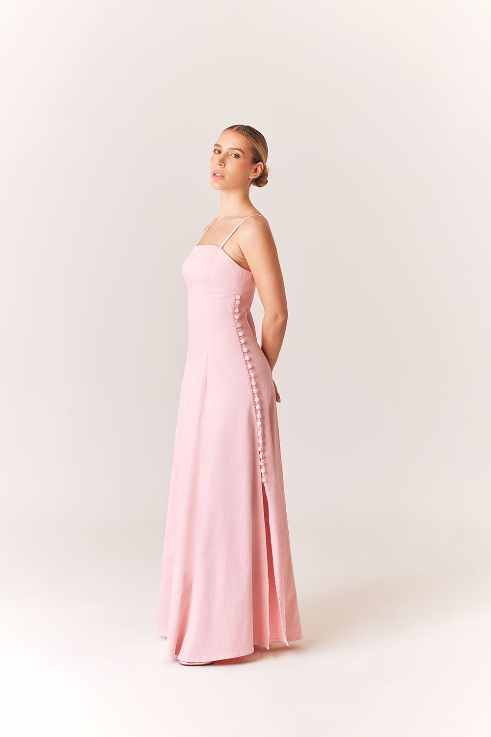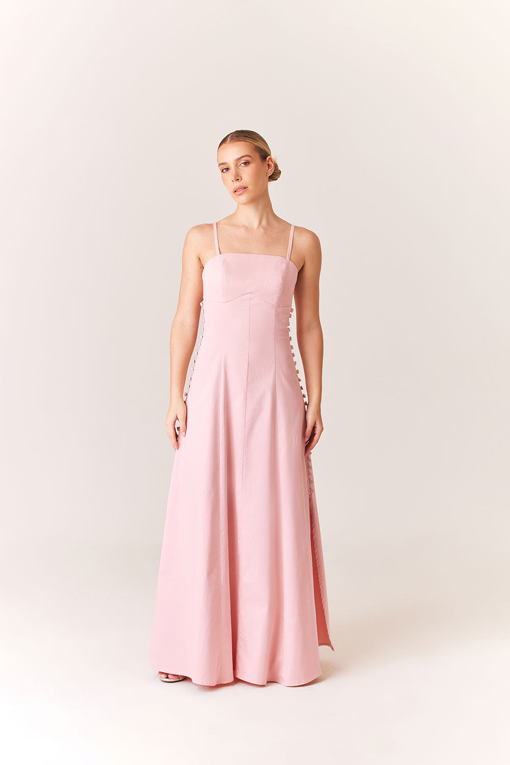 The "Isola" dress is a maxi that exudes elegance and style. It begins to open delicately from the bottom of the bust, creating a fluid silhouette. It has side buttons that go to the middle of the leg adding a unique detail to the design. With its side openings it allows you to have freedom of movement and at the same time look elegant. It is a new color of "Clarissa" Dress
