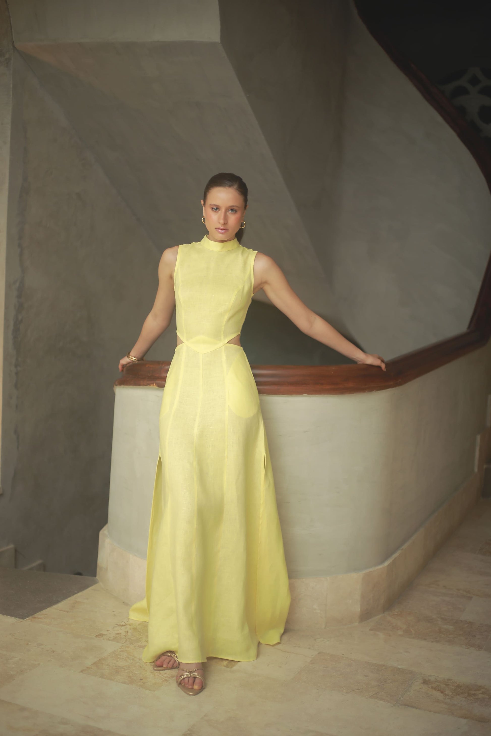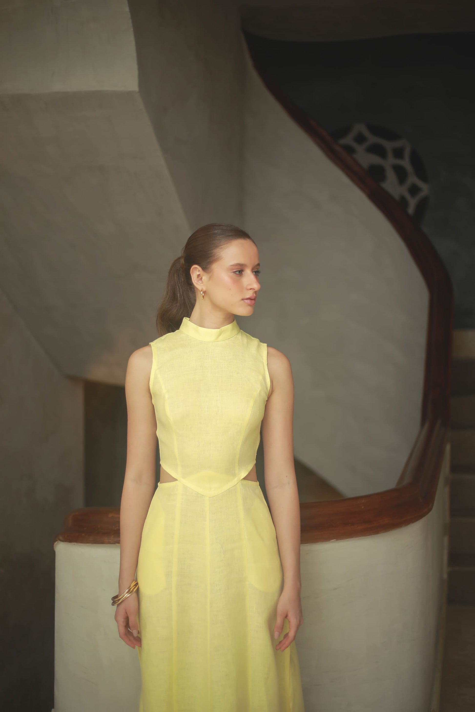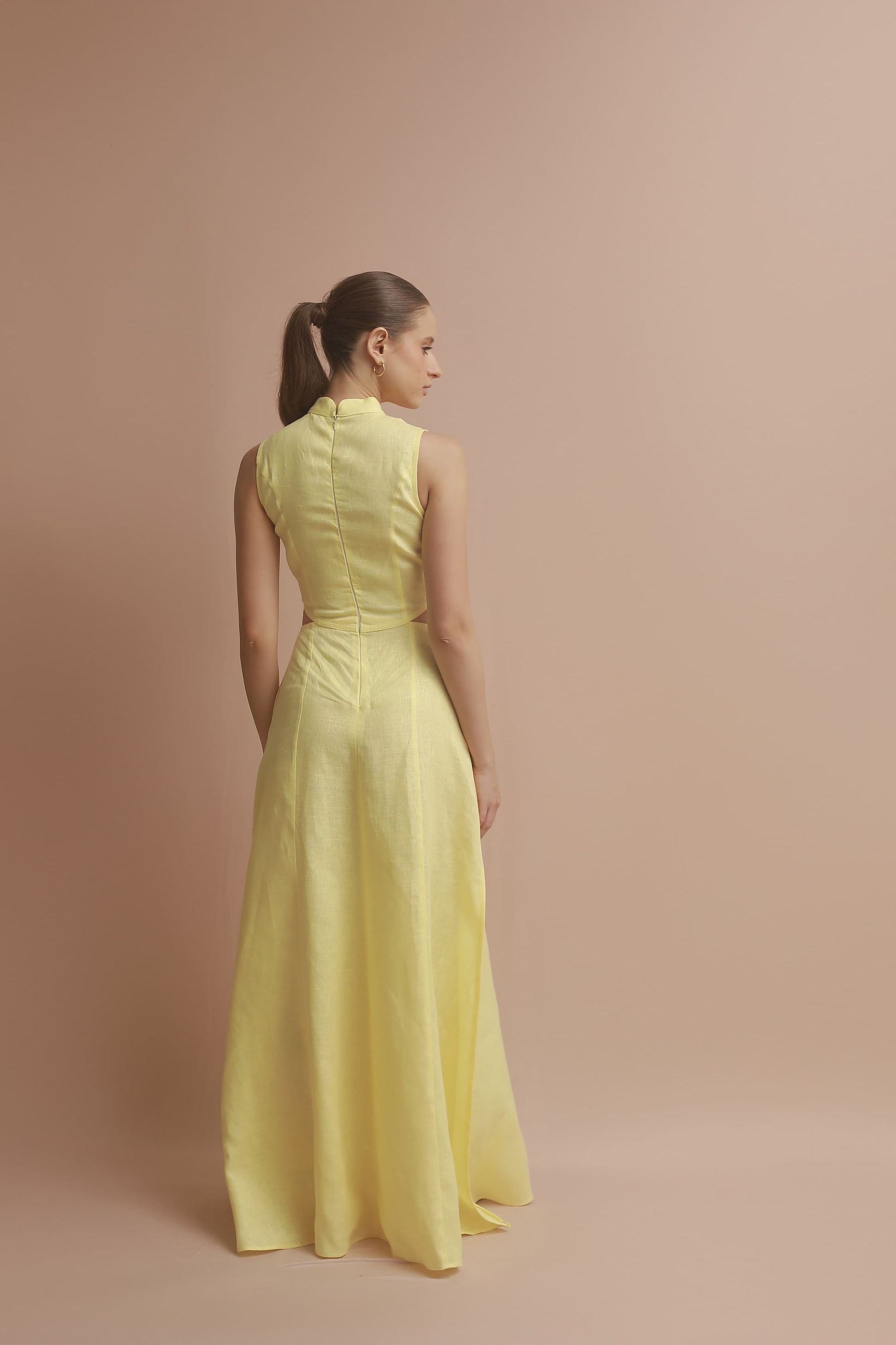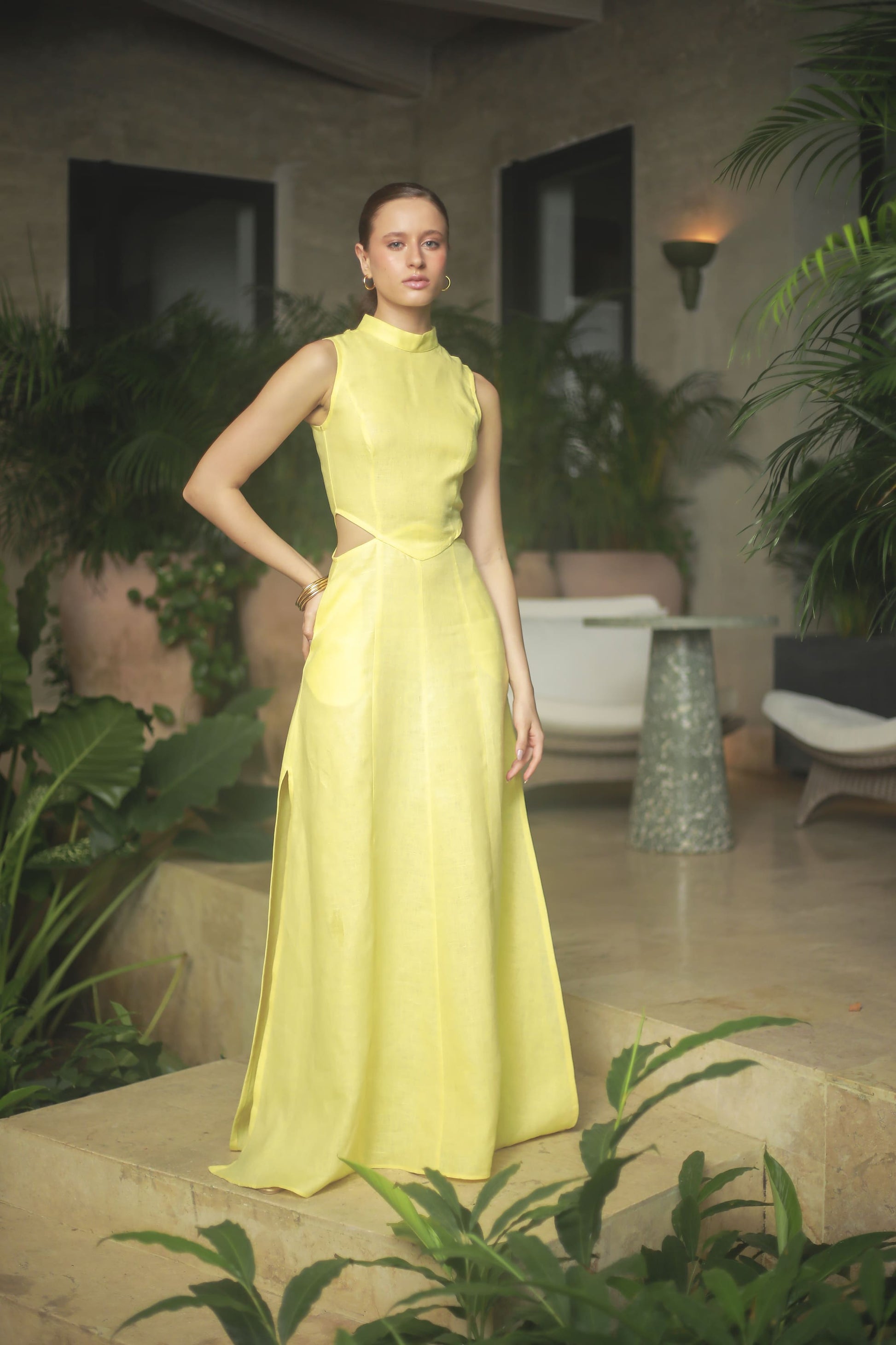 Our "Vittoria" dress is an elegant design with a halter neck and cutouts on the sides, adding a touch of sensuality and sophistication. Its length is maxi with side openings that allow fluid and stylized movement when walking.